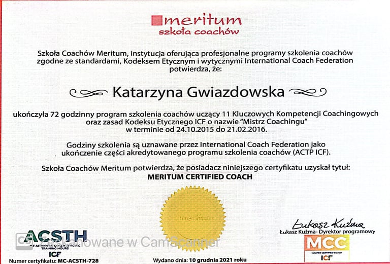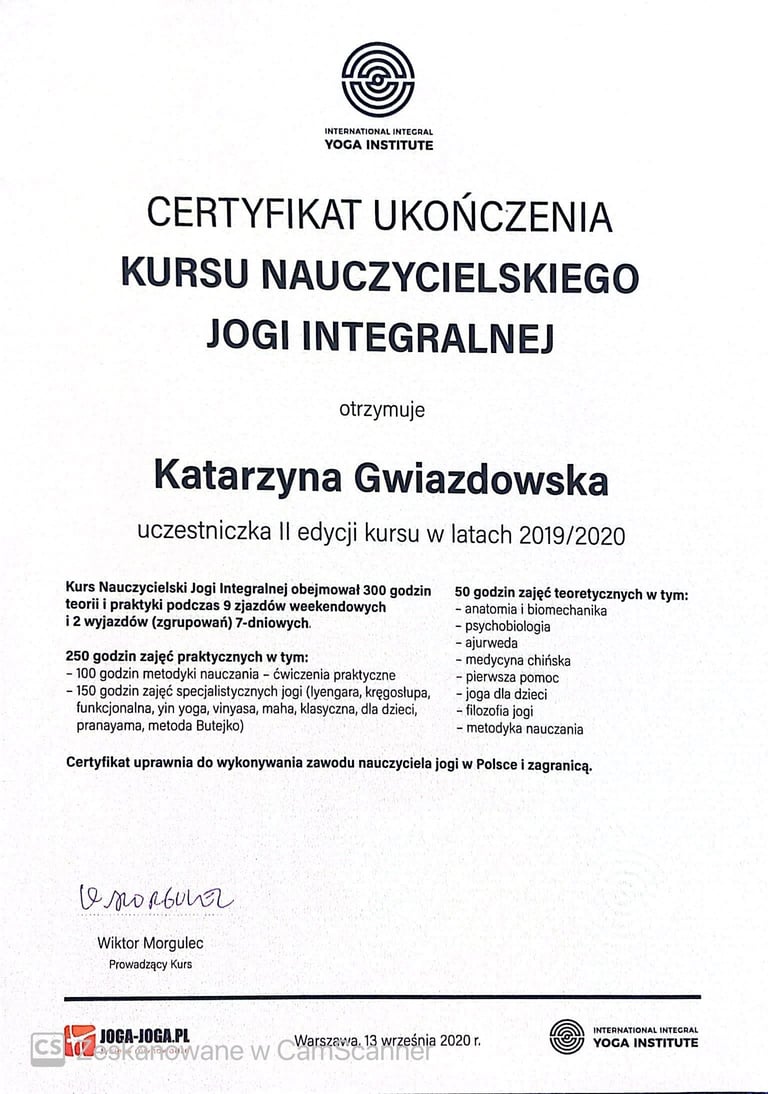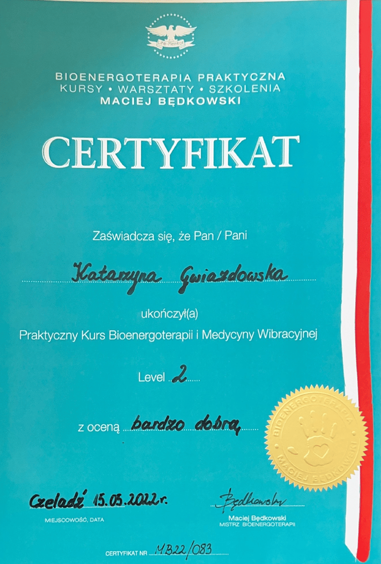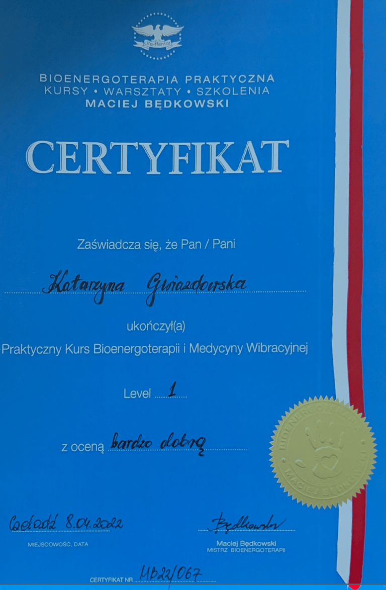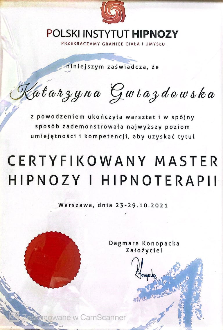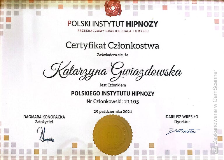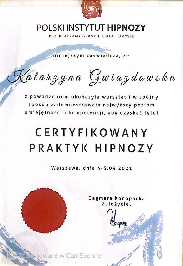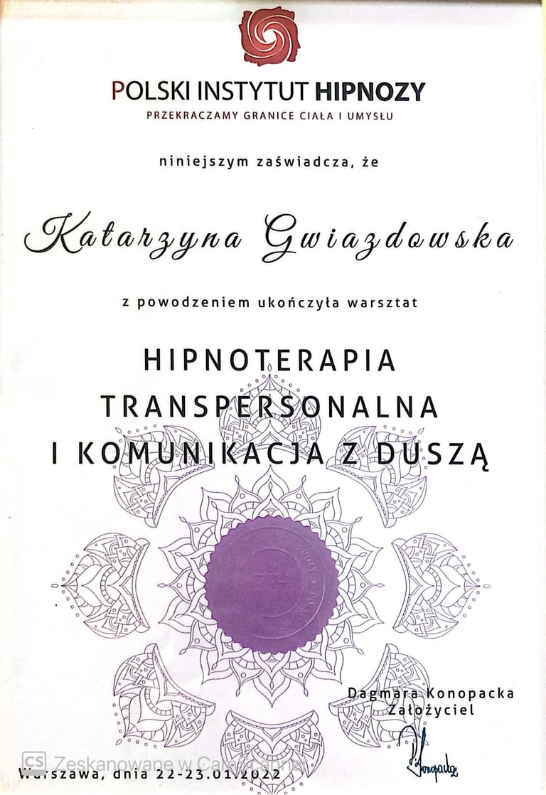 Ukończyłam certyfikację Praktyka Hipnozy, Mastera Hipnoterapii oraz Hipnoterapię Transpersonalną i komunikację z Duszą. Jestem Członkiem Polskiego Instytutu Hipnoterapii o numerze 21105. Reprezentuję podejście transpersonalne do hipnoterapii, która traktuje Człowieka jako Istotę Wielowymiarową. Z wielką pasją zgłębiam się jeszcze bardziej w tą formę hipnoterapii i komunikację z duszą.